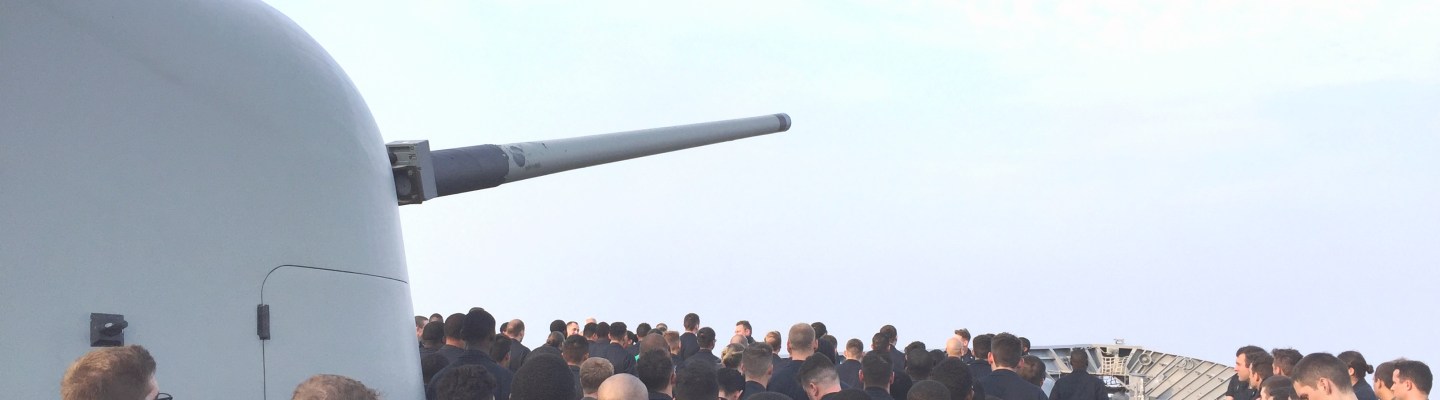After results came out last week, our Captain scheduled an All Hands Call on the ship’s forecastle. We formed up around the 5 inch gun mount. “Pinners” were present, chosen by those being advanced for having been a mentee, close peer, or mentor. As the responsibilities of a Petty Officer were read aloud by XO (executive officer), the Pinners marched forward to their shipmates formed up in front, and then placed rank insignia on each collar, symbolic weight and authority—and evidence of additional pay soon to come!